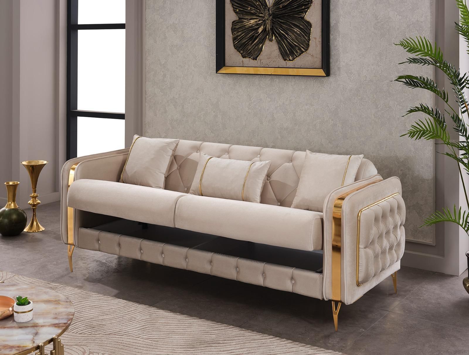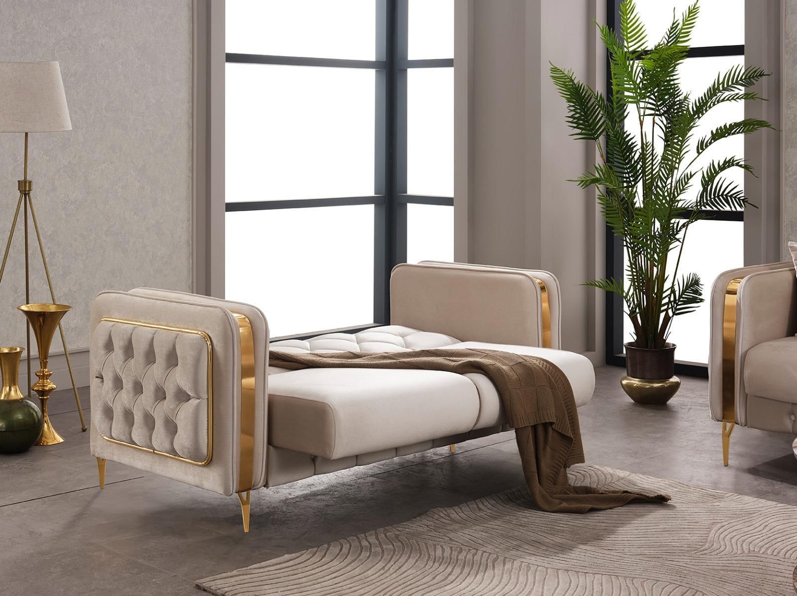 A stylish, space-saving fabric sofa bed featuring a built-in storage compartment and available in three versatile colors.