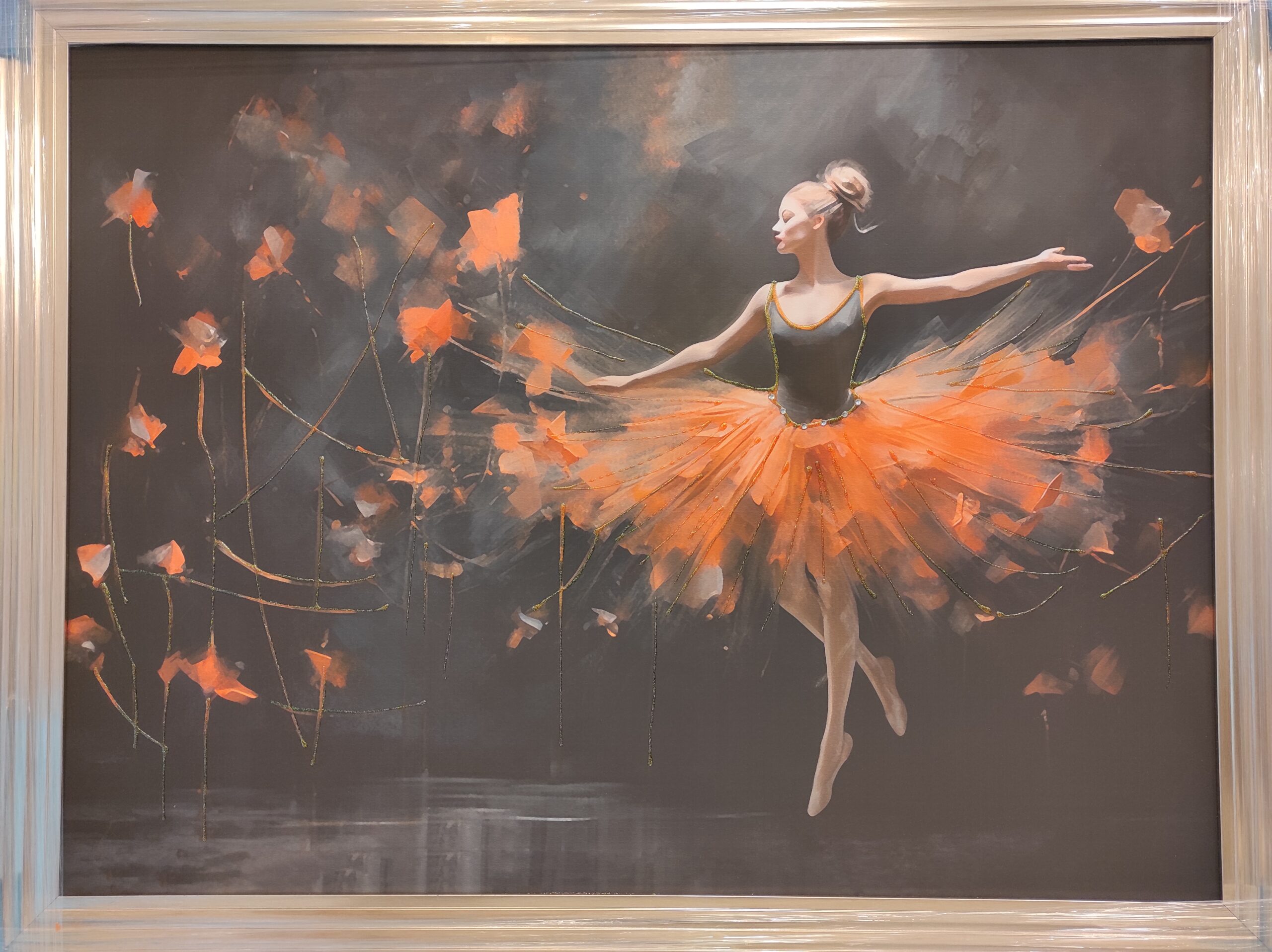 The Hand Painted Elegant Dancer Canvas will make a stunning centrepiece to your living space. The canvas features a dancer and elegantly captures her movement with the bright orange of her tutu, giving the impression that she’s on fire with a passion for her craft. The canvas offers a bright pop of colour to your home and is easy to hang on any wall via the metal clip on the back.