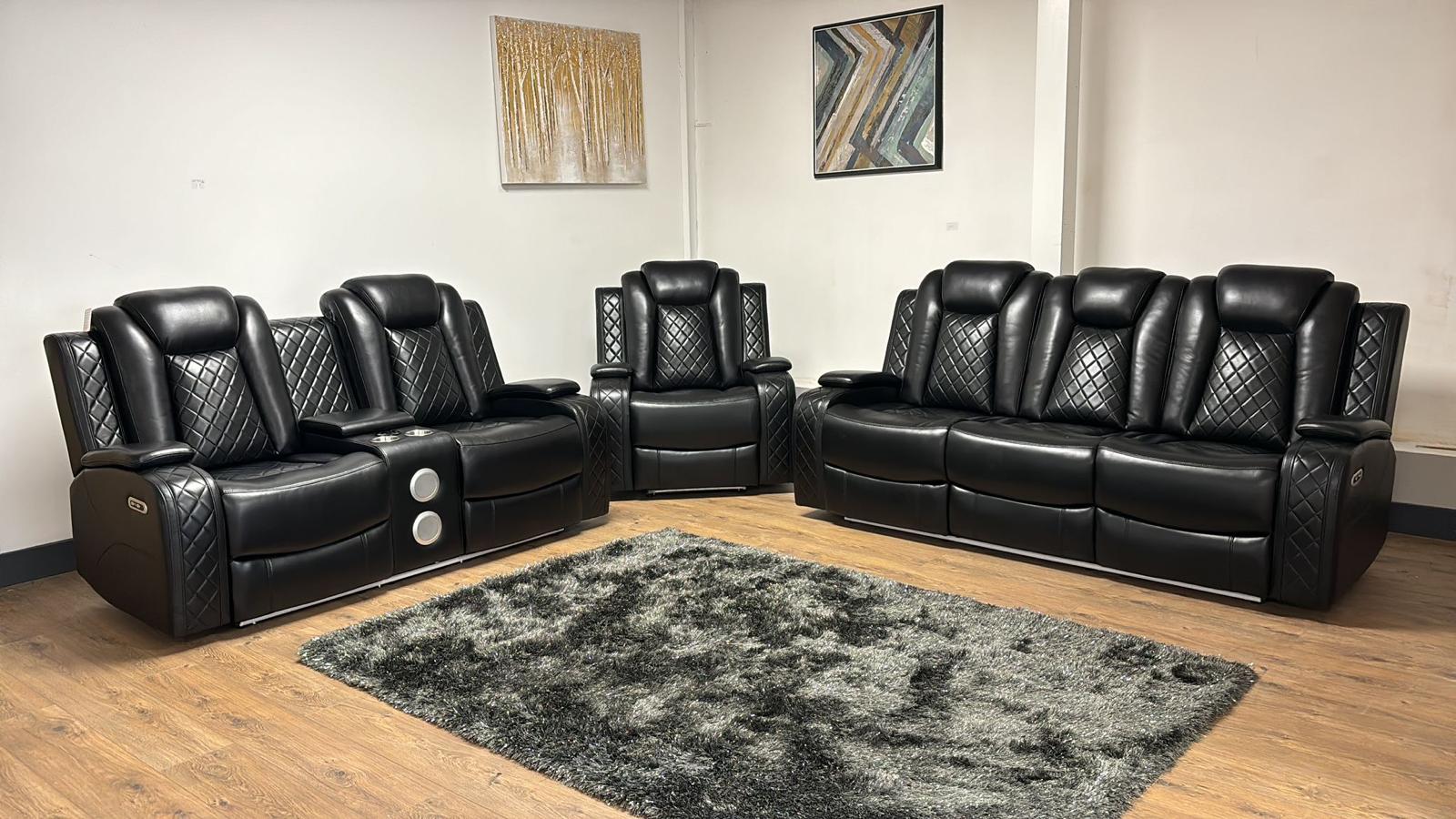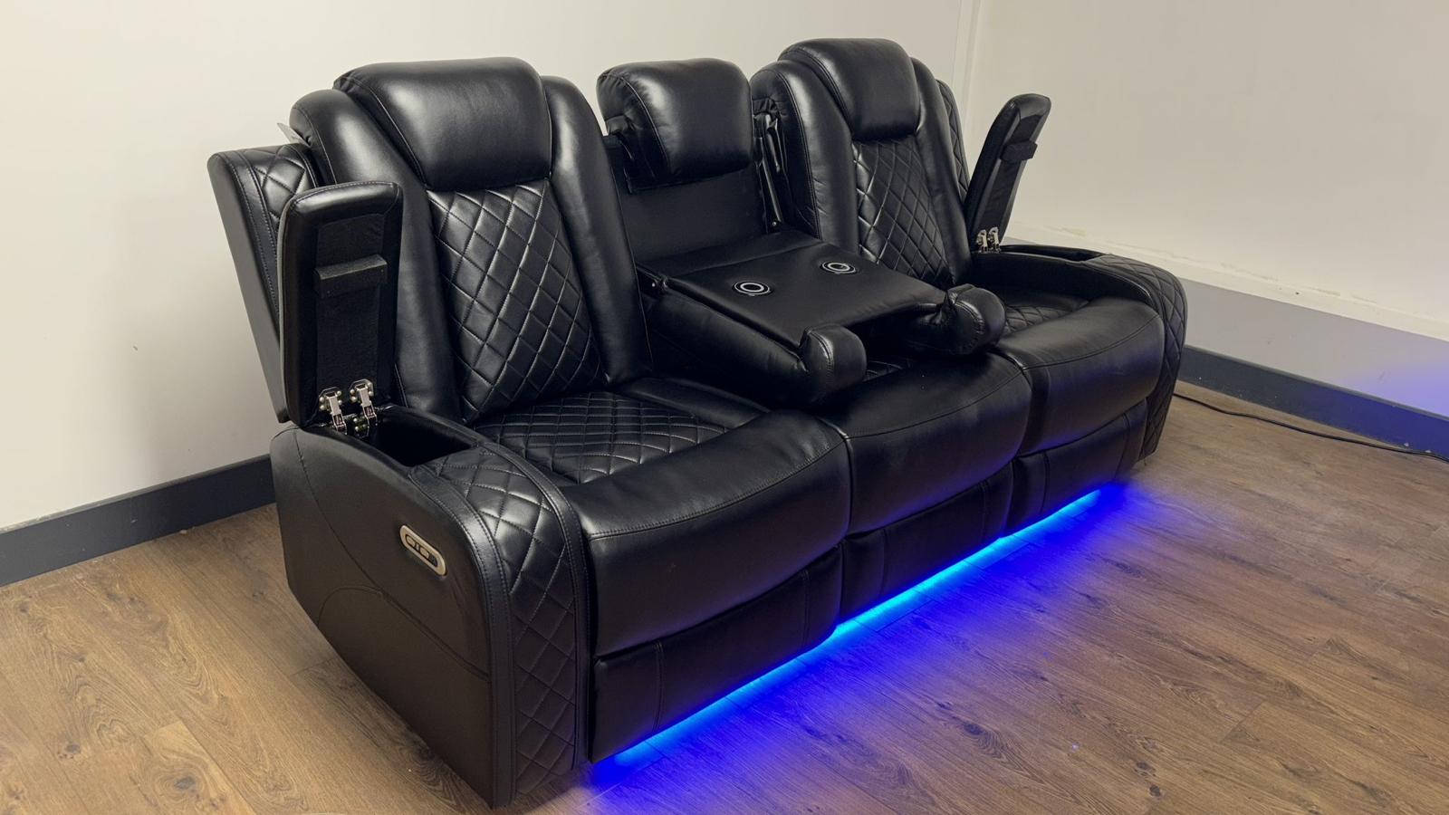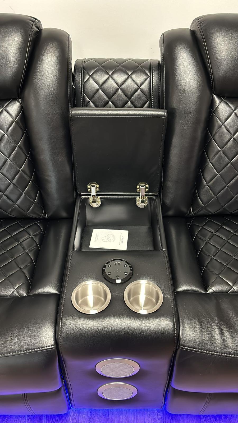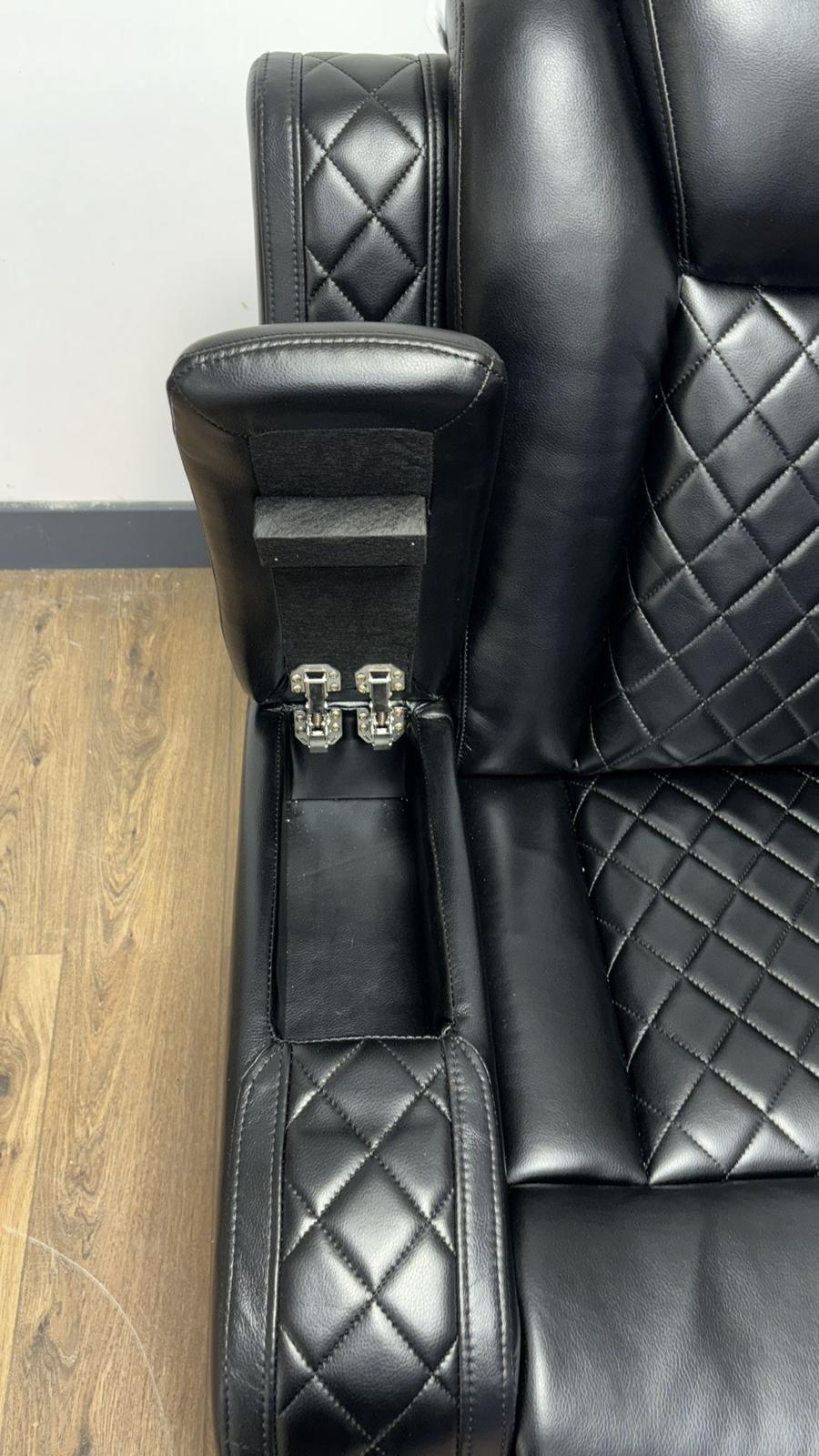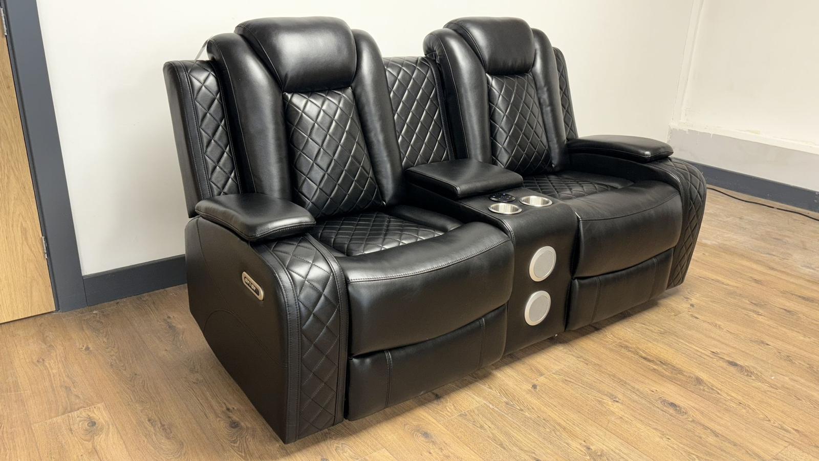 The Black Elephant skin style’ Leather has studded detailing . The sofa also contains a console unit with built-in Bluetooth speakers ,wireless phone charger port.